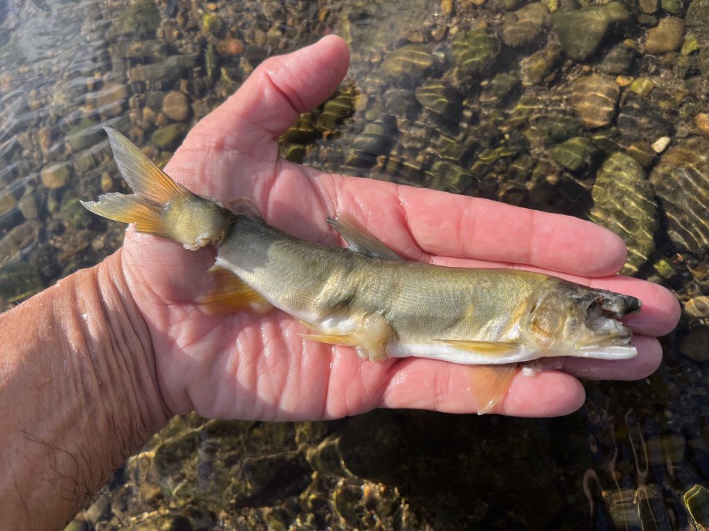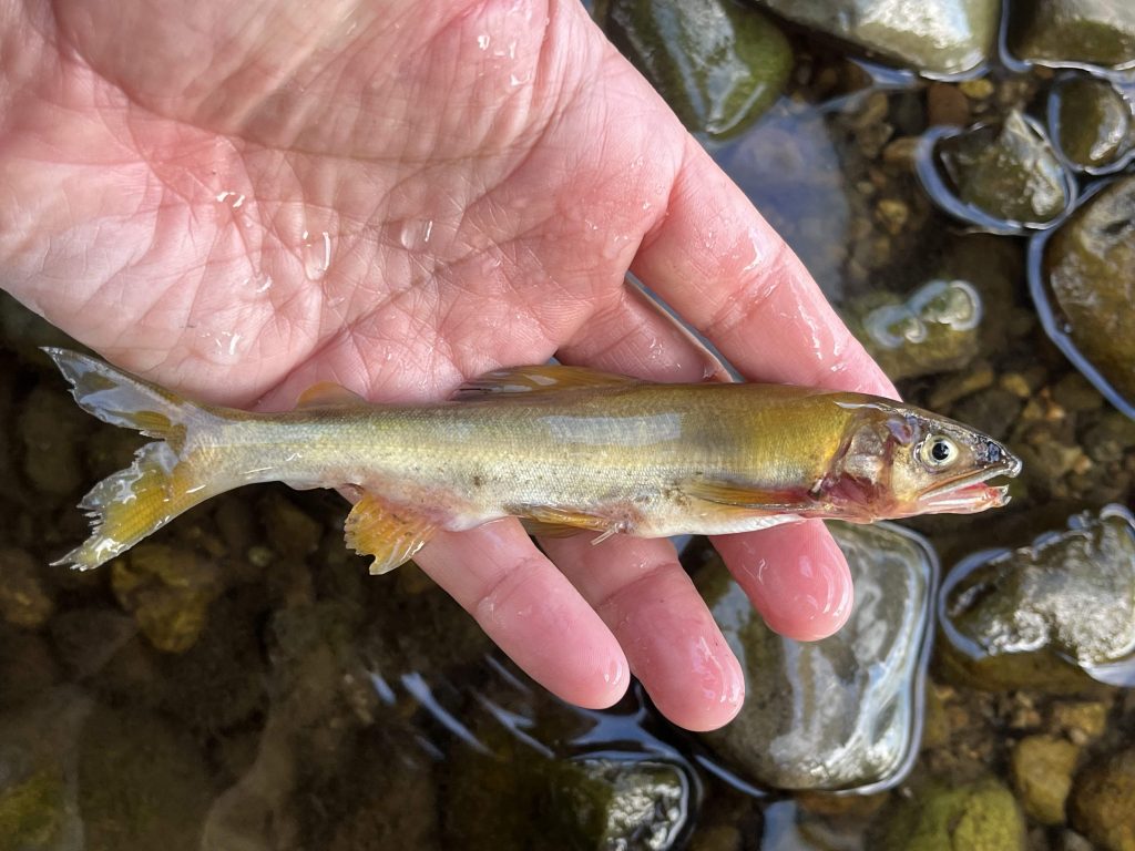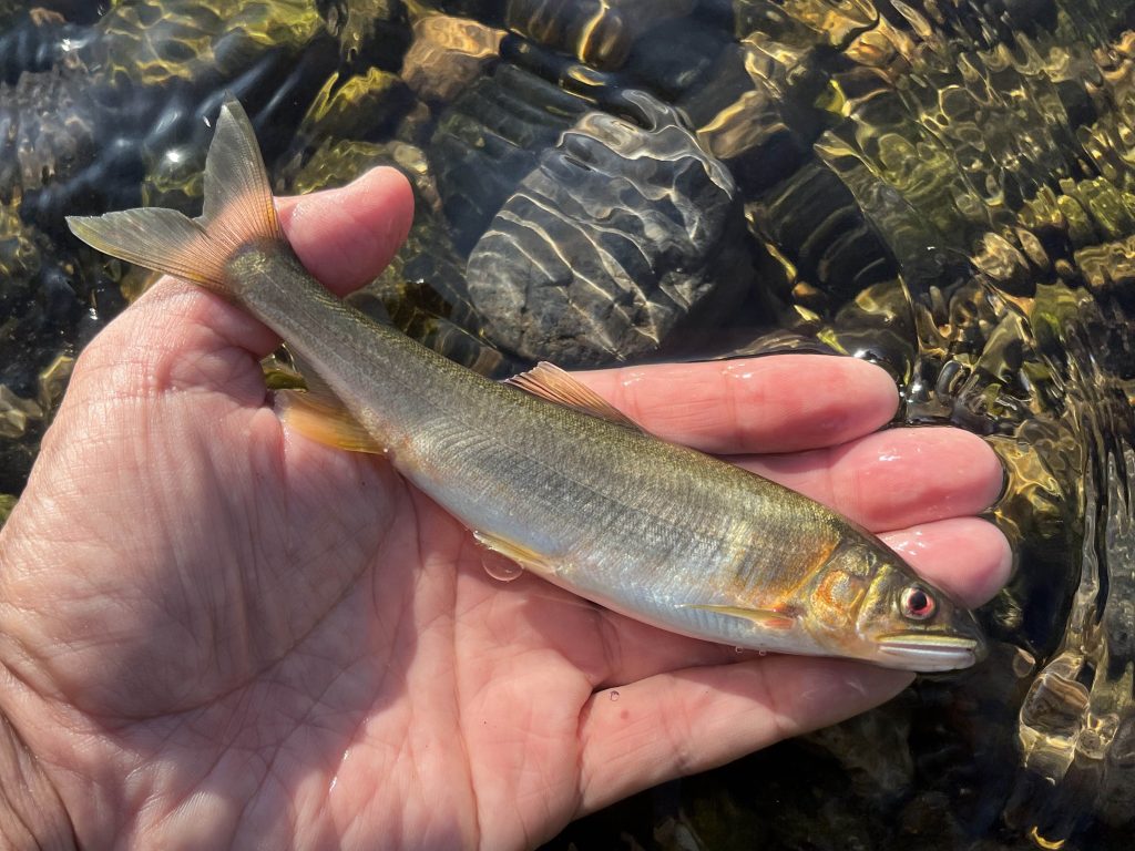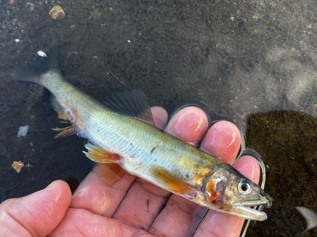 そして今朝は、ご覧のようなきれいなメスのアユが流下している姿を見ることができました。拾いあげると、まだかろうじて生きていました。外傷はなし。卵はまだお腹に残った状態。目が赤く染まり、少しだけ突出していました。冷水病の類かもしれませんが、それらしき症例もありませんでした。絶対美味しいだろうと思いましたが、時間的な余裕がなく川に戻します。