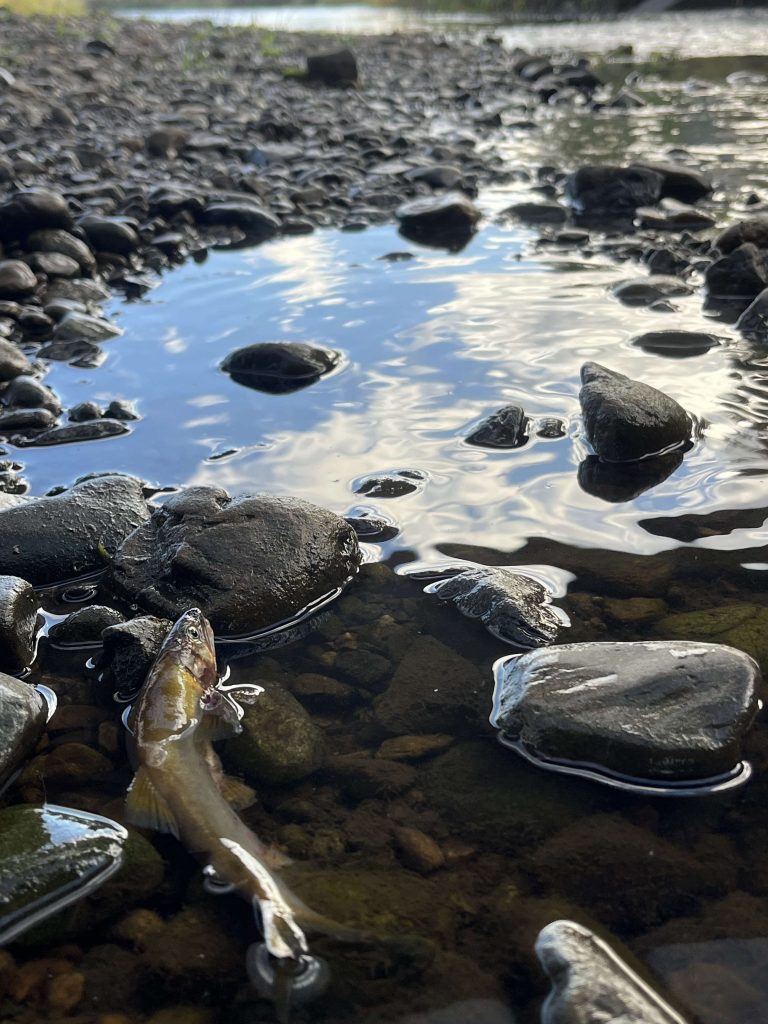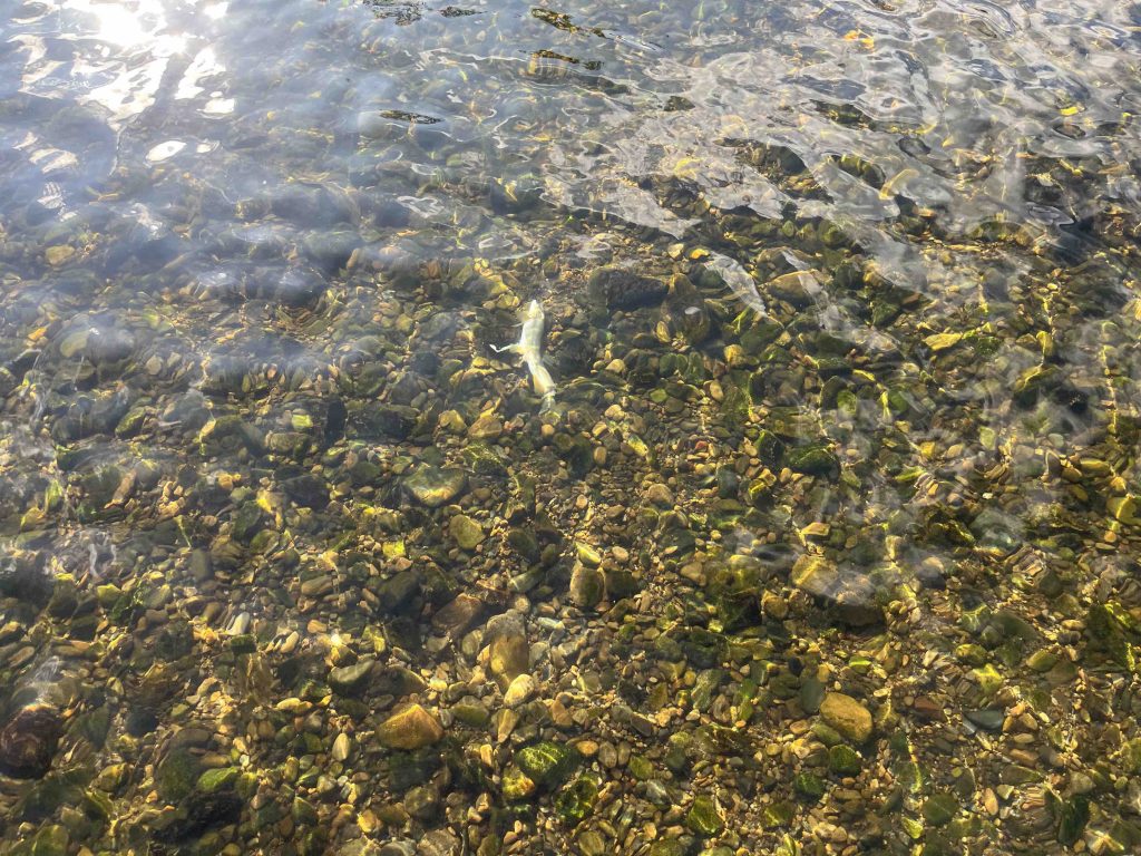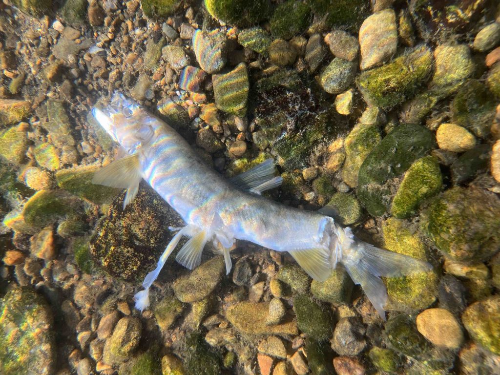 こちら昨日観察したアユ。オスでしょうか・・。臀ビレでしか私は判断できないので欠損していると迷います。臀ビレあたりが擦れているのは産卵行動に参加した証だとは思いますので、全うしたアユと言えそうです。