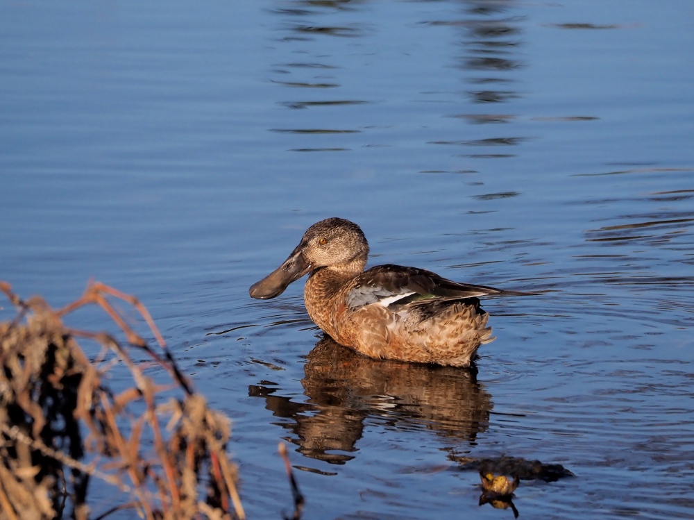 ハシビロガモ。今年は2組のペアがこの川にステイしている。