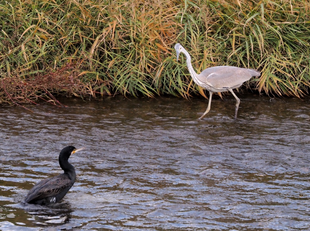 この若いアオサギもこのところのなじみだ。いつも同じ場所にいる。少し離れたところには、なじみのコサギがいて、そいつは目が合うと浅瀬での狩りをやめ、所定の位置に急ぎ足で移ると、白いタケノコのようにたたずんでしまう。安心できる場所なのだろう。